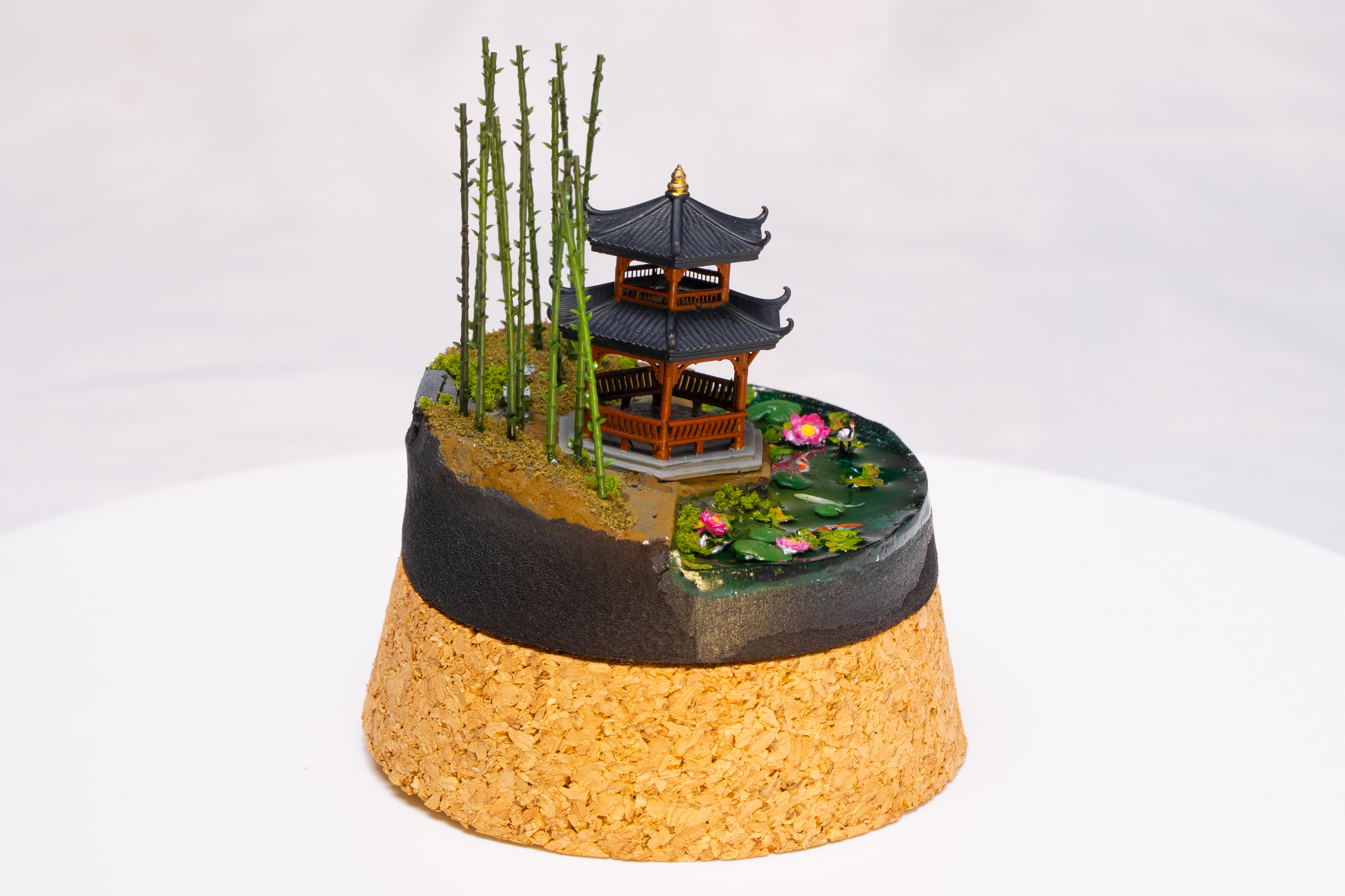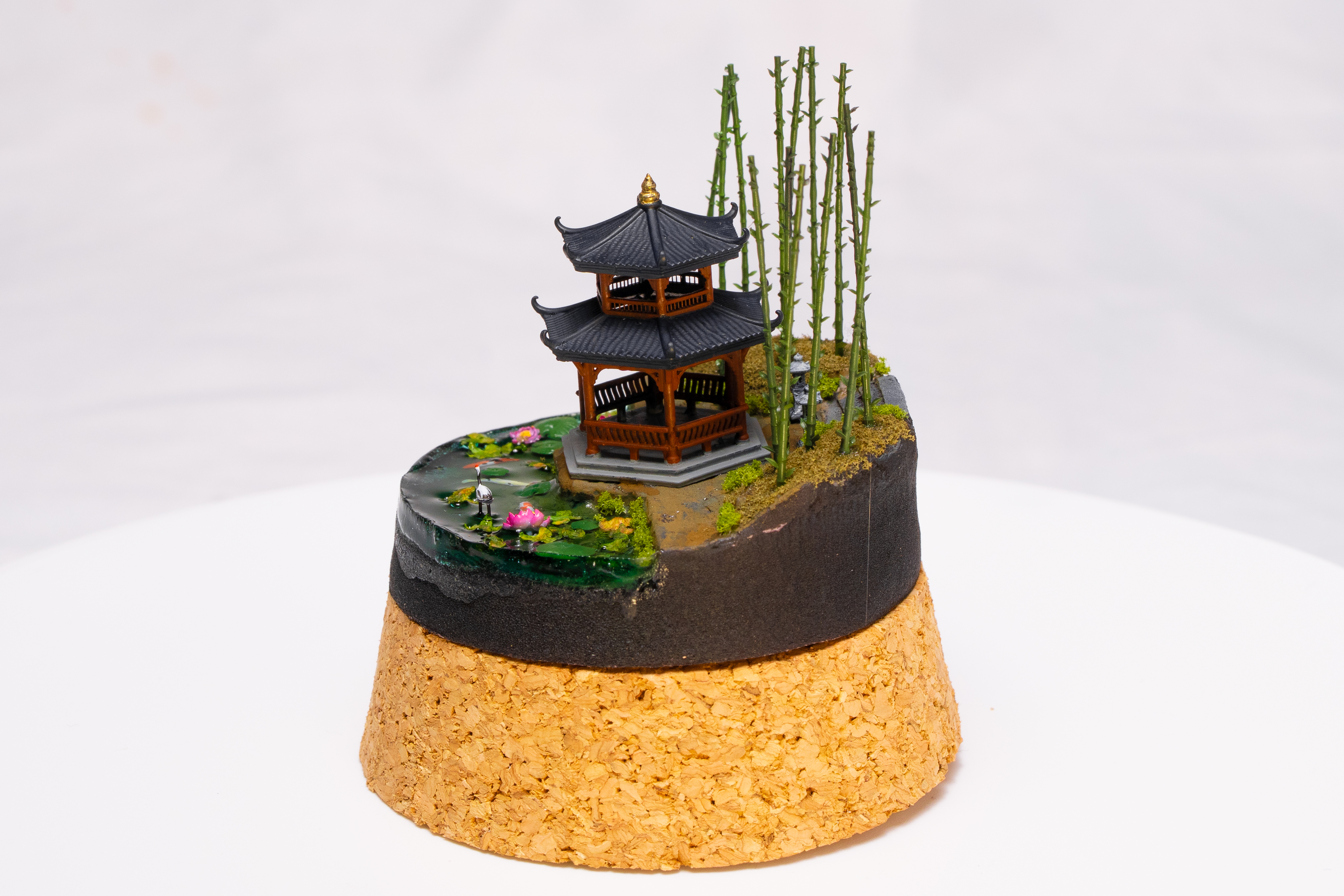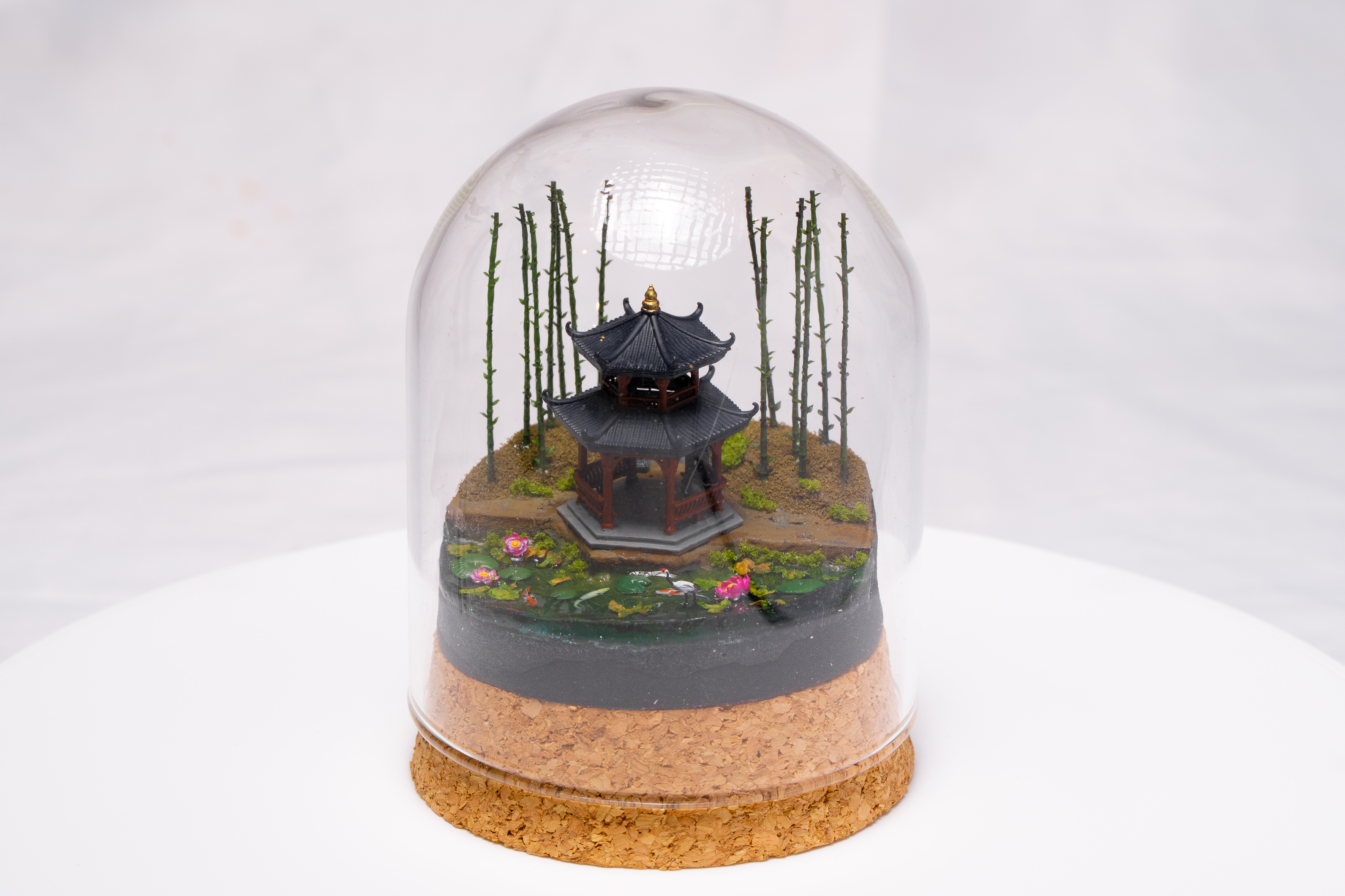 East-Asian pavilion, bamboo, and water—including a glass-dome variant. Calm, layered miniature scenes.