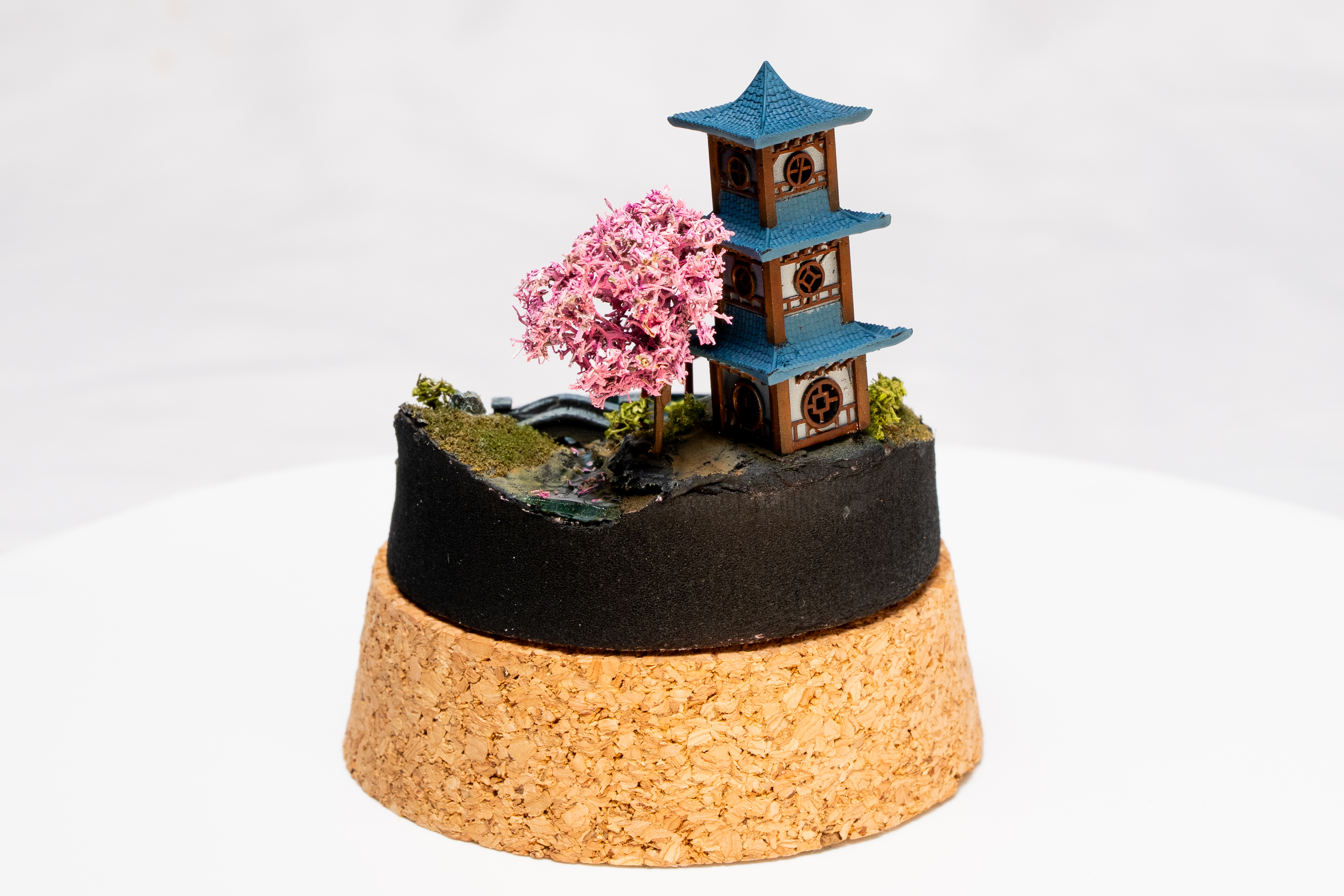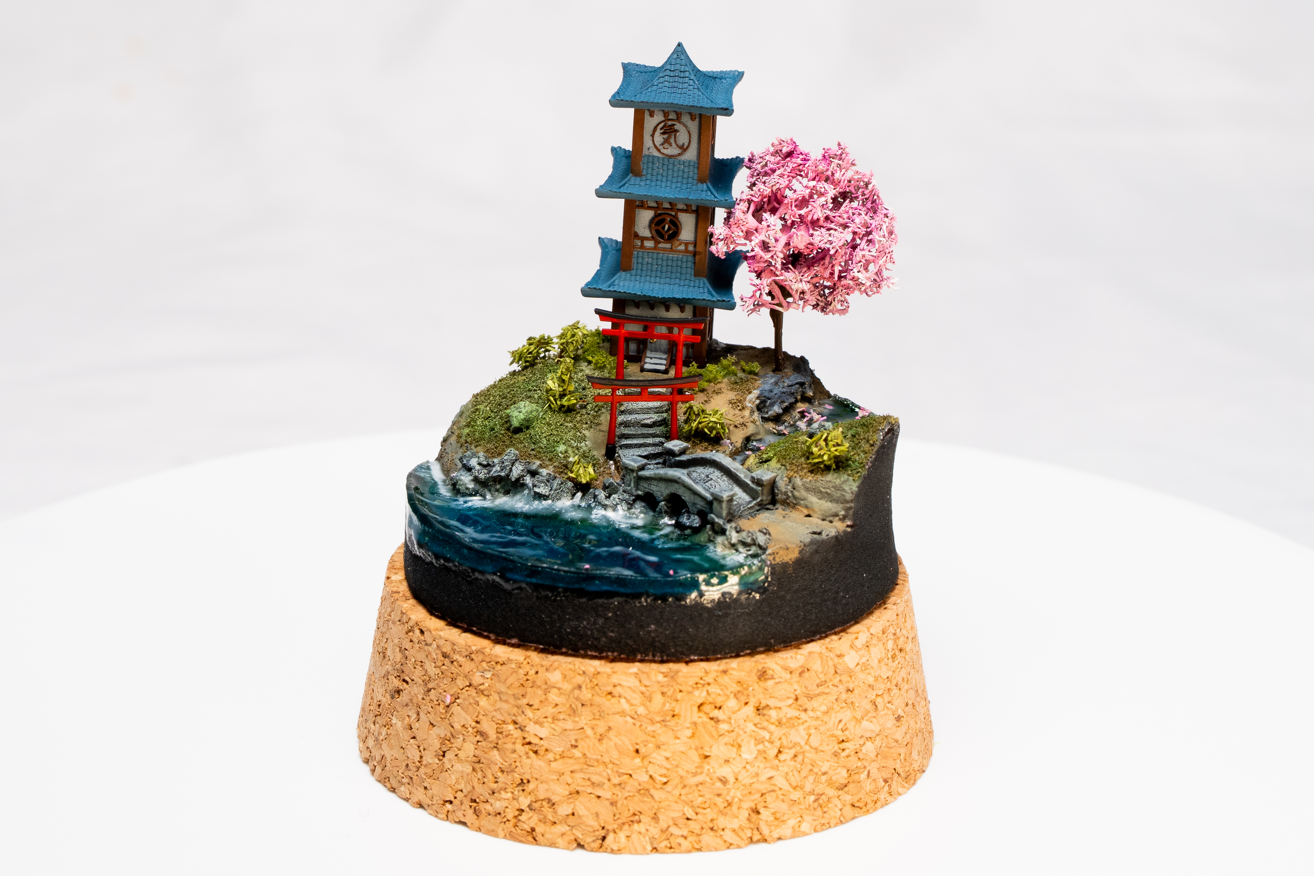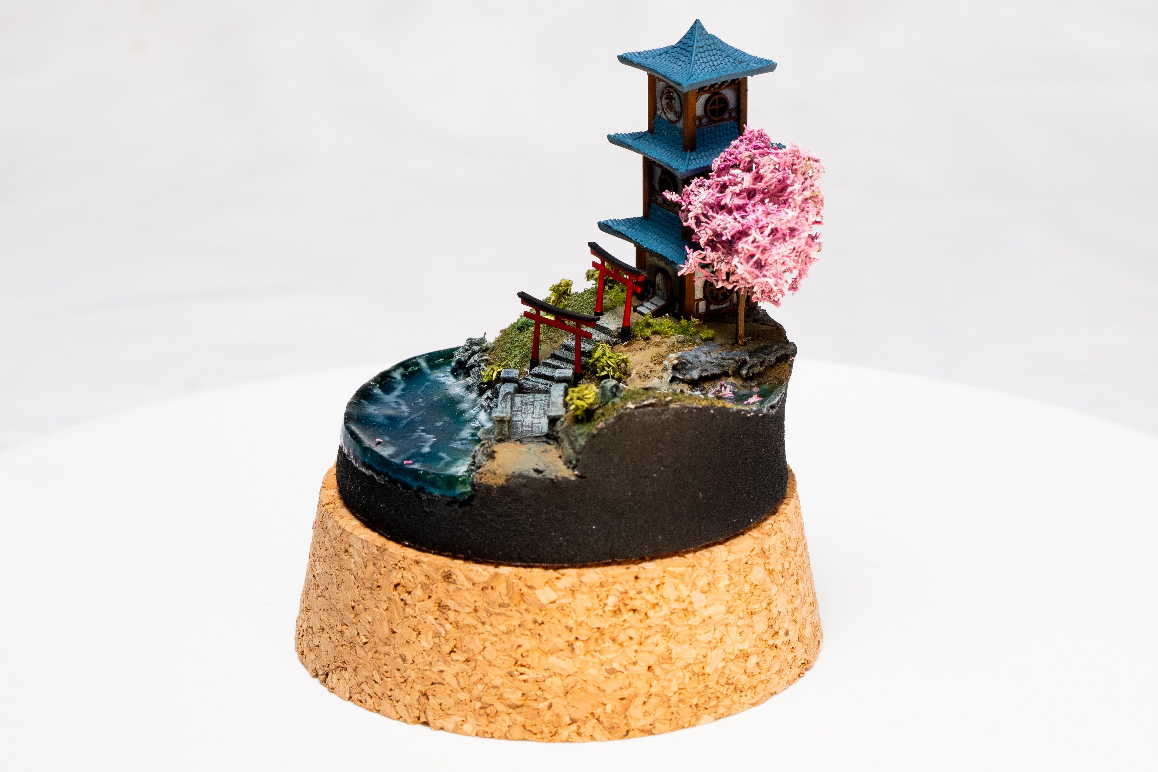 East-Asian pavilion, bamboo, and water—including a glass-dome variant. Calm, layered miniature scenes.